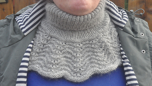 I used Pernilla 100% Peruvian Highland Wool (175m/50g) in colour 954 and Sandnes Garn “Tynn Silk Mohair”(57% mohair, 28% silk, 15% wool) (212m/25g) in colour 1022. Hold both together to knit the grey version (full neck). I used about 200m (1 and a quarter balls) of the Pernilla, and 200m (1 ball) of the mohair.