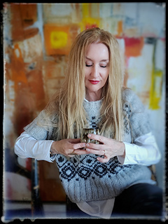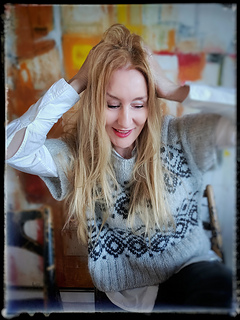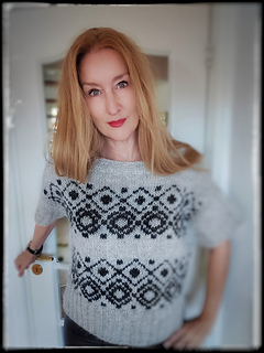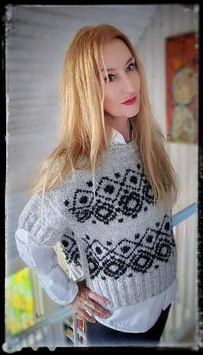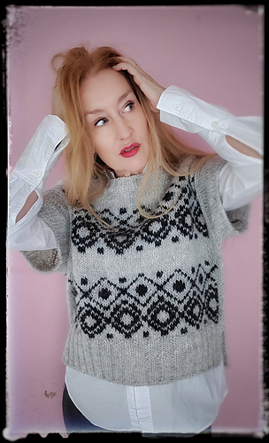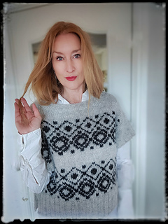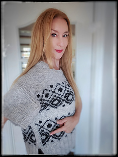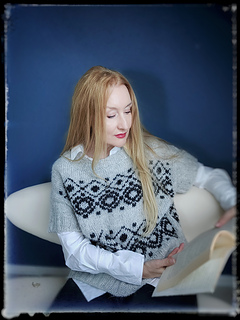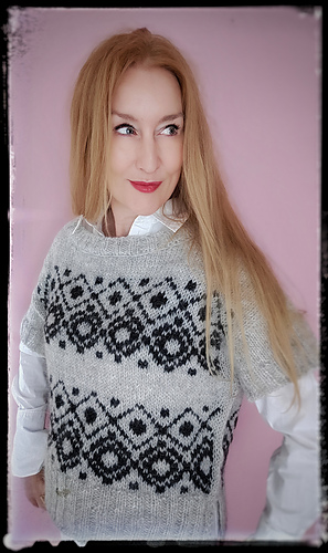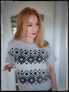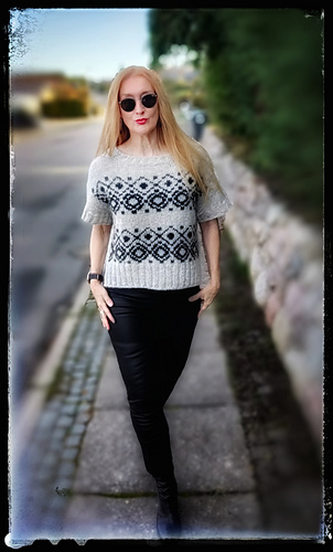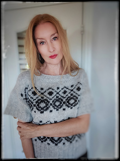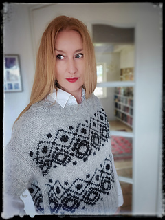 The construction is top-down with a European shoulder. First, the back is knitted down to the armhole. Then sts. are picked up for the left and right shoulders. These two shoulder pieces are joined to form the front piece, which is knitted down to the armhole. The side panels established continue under the sleeves and are kept free of the strandedpattern.