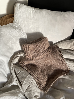 The back piece is knitted first back and forth, then stitches are picked up and knitted along the cast-on edge of the back piece for the shoulders. The shoulders are knitted and then the front piece. 1x1 twisted rib is worked on the left and right side edges first, then on the front edge and back edge. The Olive Polo Neck is also knitted in 1x1 twisted rib in the round with circular needles until your desired length.