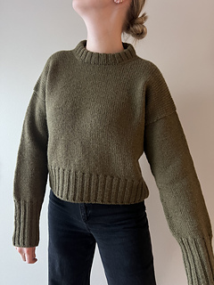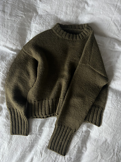 The Olivia Sweater is an oversized sweater. The sweater is worked in stockinette stitch. First, the back piece is worked flat with short rows to shape the shoulders, before stitches are picked up for the shoulders to then work the front piece. The work is then joined, and the body is worked in the round. After that, stitches are picked up for the sleeves, and these are worked. Both the body and sleeves are finished with long double rib cuffs. Finally, stitches are picked up for the neckline, which is also worked in double rib.
