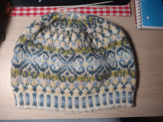 The beanie starts with a corrugated rib and is worked entirely in the round with a pattern based on traditional Fairisle motifs. It is has been designed to pull down low over your ears to protect them from the biting North winds! Otherwise it can be worn further back on your head as a slouchy style beanie.