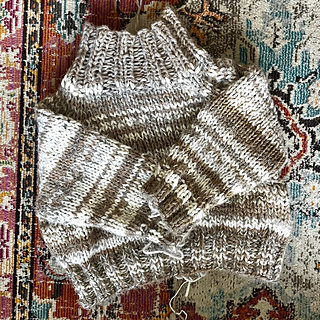 Beige Striped chunky sweater: a variety of scraps, mostly LionBrand Thick & Quick, Cascade Baby Alpaca Chunky, and mystery scraps (this is VERY thick)