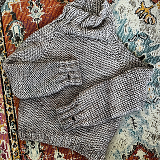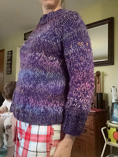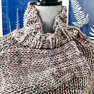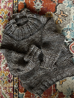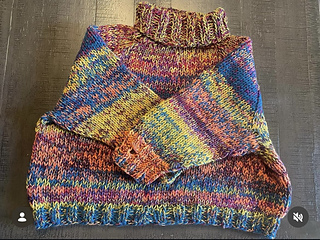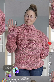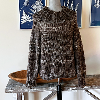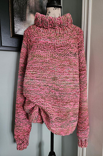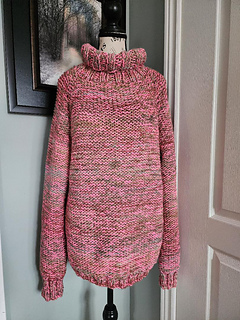 The sweater is knit in the round from the top down, with yarn over raglan increases to the sleeves, which are placed on hold while the body is finished. Each sleeve is then picked up and knit in the round to the chunky ribbed cuffs that include thumbholes for maximum coziness. The chunky ribbed neckline can be knit as a foldover turtleneck or a mock turtleneck, and bottom band is an easy 2x2 rib. You can knit the body longer or shorter, depending on how you roll.