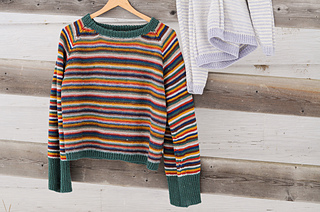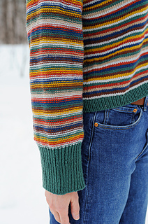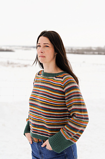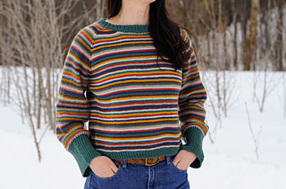 On The Flipside is a raglan pullover worked seamlessly from the top-down, with the start of the yoke worked flat to shape the front neckline. After the neckline is shaped, the garment is joined to work in the round. Front, back, and sleeves are worked in the round as a yoke, with compound shaping within along the raglan lines to provide an ideal fit across all nine sizes. The sweater is worked in stockinette stitch on the front and back sections, with reverse stockinette on the sleeves. These stitch patterns are reversible, so that the pullover may be worn inside out if desired. Once the yoke is divided for body and sleeves, the body is worked in the round with minimal decreases. Two options are given for the sleeves: one with a slimmer sleeve and narrow, short cuff, and the other a wider sleeve with a wide, long cuff. The collar is picked up and worked twice as long as required so that it may be folded in and seamed, to hide the pick up line, in order that the sweater may be worn reversed. Unfortunately, you will need to weave in the ends while working flat, but for a two-colour version, I have a trick to hide these colour changes once you are working in the round so that you do not need to break the yarn. If you are planning to do a scrappy project, I don’t recommend making it reversible. You may consider braiding the ends along the inside of the work, instead. Trying to weave in a thousand ends that look neat on both sides is a bit of a nightmare. But if you are up for a challenge, go for it!
