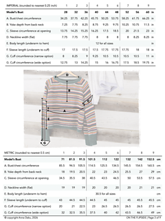 This pattern has 9 size options. Using the recipients chest measurement, choose a size that will give 6 inches (15cm) of positive ease at bust (the difference between body’s smaller measurements and the garment’s larger measurements at this point). It is also intended to provide 4 to 4.5 inches (10 to 11.5cm) of positive ease at bicep. Photos shown size 4 with 8 inches (20.5cm) of positive ease. The most fool-proof method is to measure a similar fitting garment in your wardrobe and choose a size that matches. See schematic in photos.