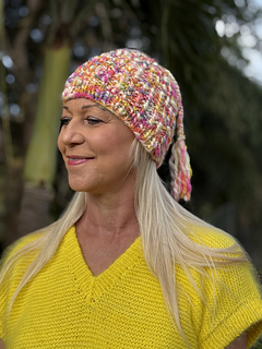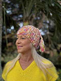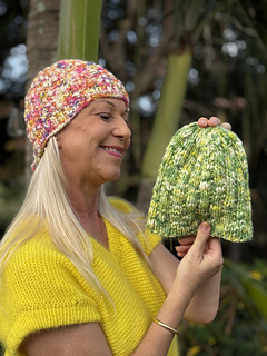 This hat is a wonderful accessory — fully reversible, with one side showing more of the thick-and-thin texture and the other appearing neater and more polished.
