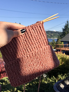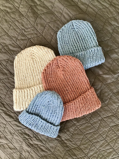 with anyone’s style - no matter the age or gender. This hat is made with a simple 1x1 twisted rib stitch and a fold over brim. It is designed to extend a little higher than the crown of the head instead of sitting close like a beanie.