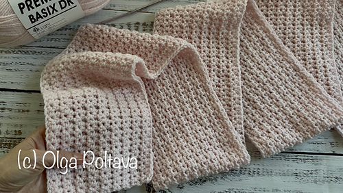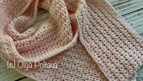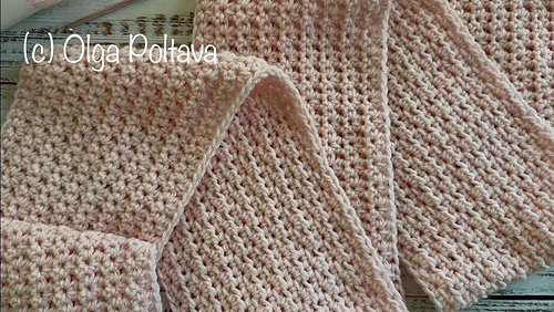 The finished measurements are about 66 inches long and 5.5 inches wide. The pattern can easily be adjusted to other sizes (the multiple for the stitch is included in the pattern), but you will need more yarn. This pattern can be used for a variety of other projects, such as a blanket, a sweater, a cardigan, etc.