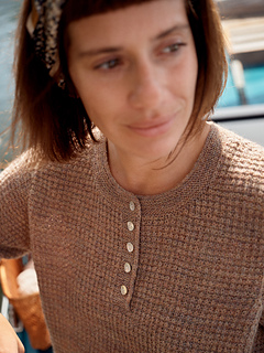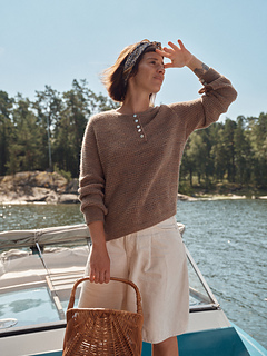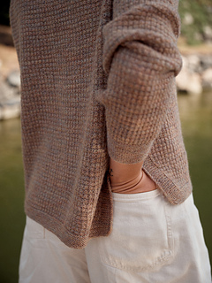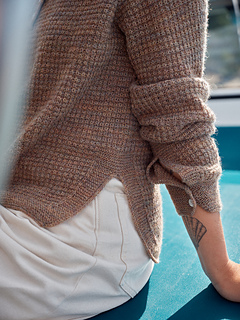 This sweater is like a cross between a henley and an overshirt: comfy and easy to wear. The textured pattern — reminiscent of a waffle weave — is combined with some garter-stitch details. Sara Ottosson’s inspiration for the pattern was the garments you own that you can throw over anything, anywhere. The name is inspired by the film Only Lovers Left Alive, a low-key vampire drama where the characters feel as timeless as this design.