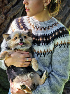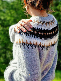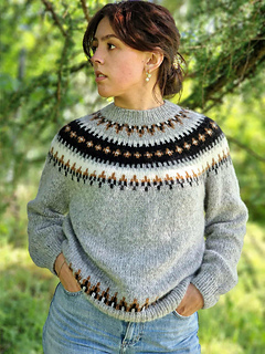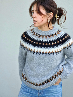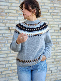 The Ontika jumper is worked on circular needles from the top down with a circular yoke. First, the neckband is knitted in rib, then the yoke is worked in colourwork following the chart and in stocking stitch according to the pattern, before the work is divided for body and sleeves.
