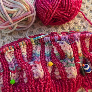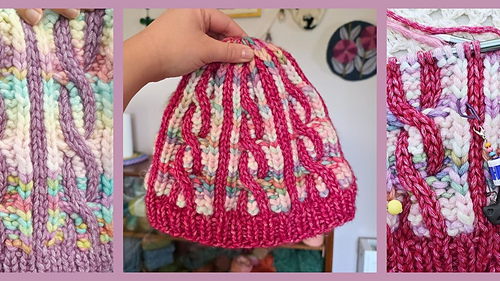 This pattern is aimed at adventurous beginners and intermediate knitters. You’ll be knitting in the round and incorporating both cable knitting and stranded colourwork.