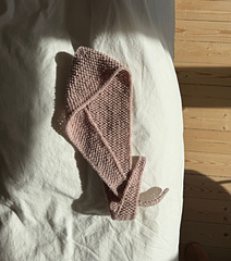 Ophelia Scarf strikkes frem og tilbage i ét stykke i retstrik med i-cordkanter fra spids til spids. Ophelia Scarf strikkes i et perlestrik mønster. Den lille størrelse Ophelia Scarf kan nå én gang rundt om halsen, mens den store størrelse kan nå to gange rundt om halsen.
