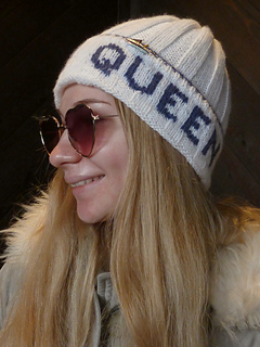 A ribbed beanie hat in two colours: navy (or denim) and white, with a turn-up cuff or brim. There are options for knitting flat with a seam, or for knitting in the round, and options to knit the hat with a small, medium or large number of sts per row or round. The height of the hat body is infinitely adjustable. The hat can be knitted with a ribbed brim, or with fairisle letters, spelling “MEDWAY QUEEN”.
