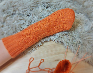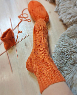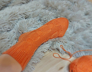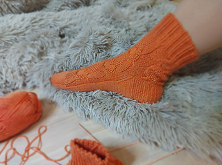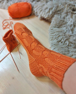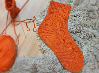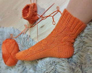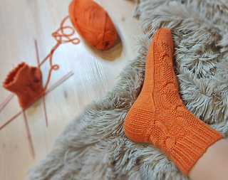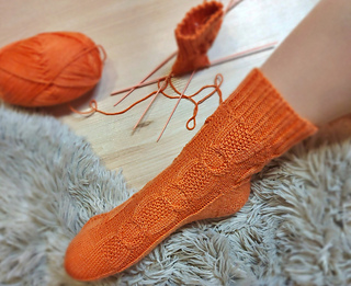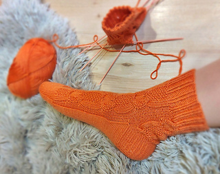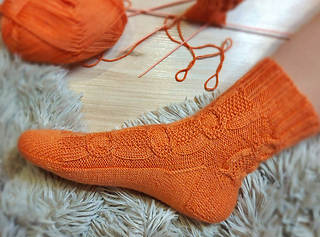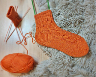 Skills required: basic knitting skills, decrease, increase, basic sock skills, short rows, heel flap, gusset, turning the heel, short row toe, lace, Kitchener stitch, cable.
