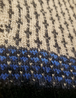 The background color includes Knit Picks Palette, Wheat Field, and the contrast colors include Knit Picks Palette, Asphalt Heather and Knit Picks Palette, Chicory. All are 100% wool fingering weight yarn.