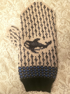 Orcas are fascinating creatures of the ocean that here find their home on these cozy mittens in black and white with a pop of blue. Using a stretchy cast on to start the cuff, the thumb is constructed by increasing on either side of a center seam.
