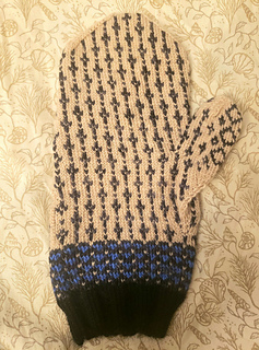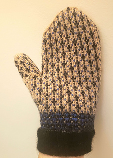 Here, two colors were used for knitting then, then the individual single blue stitches were added with duplicate stitch; alternatively, the mittens can be knit working all three color at the same time by following the Duplicate Charts as the regular colorwork charts.