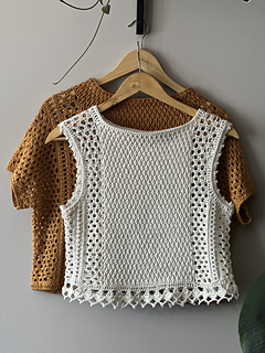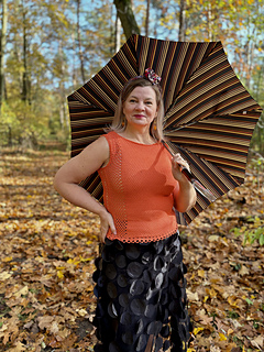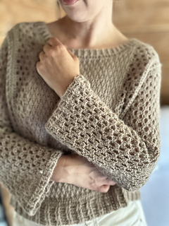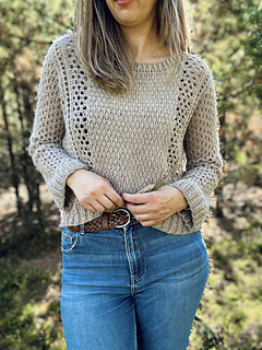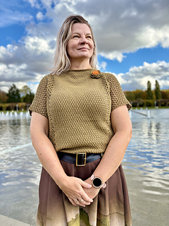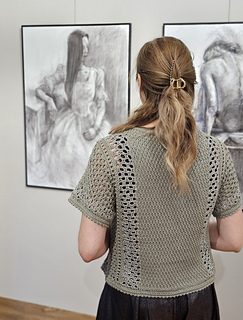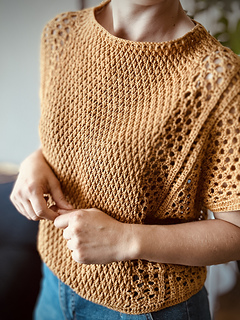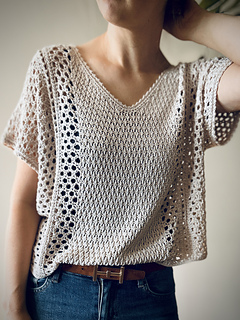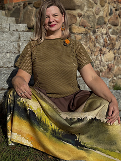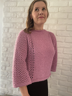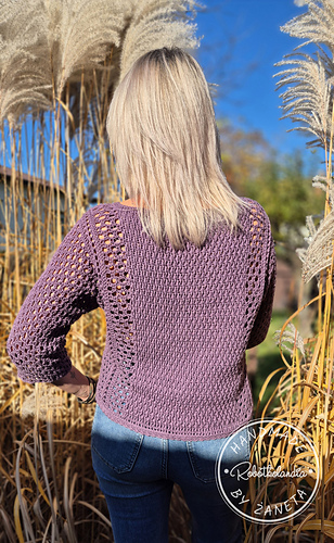 Bluzka Ori jest robiona metodą “na miarę”, wzór zawiera wskazówki jak zachować proporcje ściegów dla poszczególnych rozmiarów.