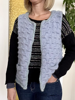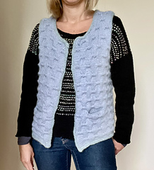 The back and fronts are then joined and worked together continuing in the textured stitch. All finishing is done in I-cord. You can work it with or without pockets.