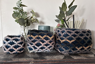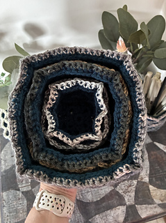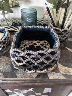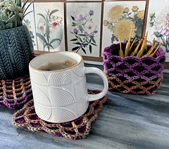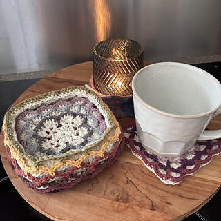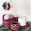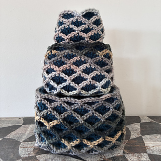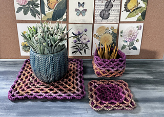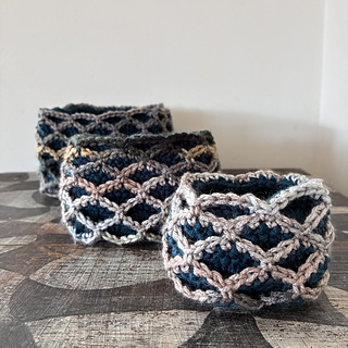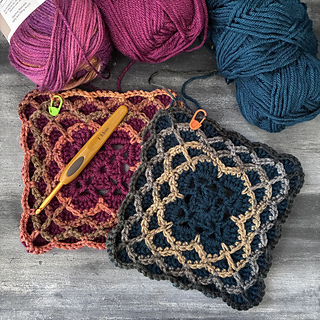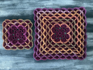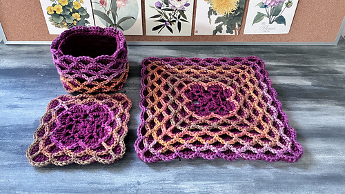 Oscillations is a square design that features bold oscillations on the surface. The fabric works up three layers thick, making it ideal for thermal projects. It’s well suited to coasters, trivets (depending on yarn composition), and blankets, thick, warm, and visually striking. It can also be turned into nesting baskets
