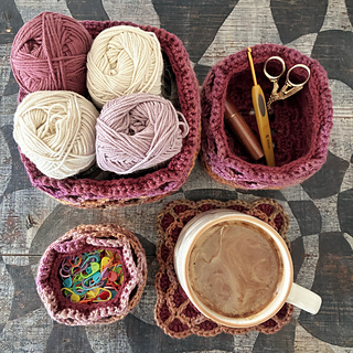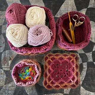I made the set of 3 nesting baskets, a coaster, a 24cm mat and scissor keepers using approximately 500 m of MC and 250 m CC