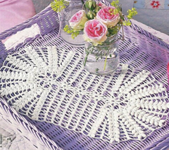 Oblong doily with 5 daisy motifs in center, popcorn puff stitches on ends.