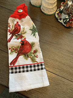 The woven kitchen towels are readily available, I got mine from the local dollar store, and the yarn was scrap that was on hand. Each purchased towel will make two hanging towels.