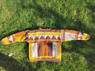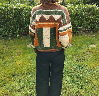 This oversized vintage sweater is worked from the bottom up. The front and back pieces are knitted flat, as well as the sleeves, which are then sewn onto the body. The design combines stockinette stitch for the main fabric with neat 1x1 ribbing at the edges.