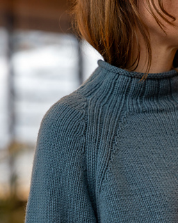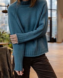 The sweater is worked seamlessly top down. First, the turtleneck is worked, then the neckline is shaped using short rows (working back and forth). Then work is continued in the round and increases for body and sleeves are worked. After completing all raglan increases, the sleeves are separated from the body. The sleeves and body are finished with a wide ribbed border. As the sweater is knitted from top to bottom, it is possible (and advisable) to try it on while knitting, so that the length of the body and sleeves can be adjusted individually.
