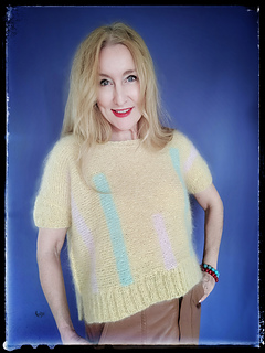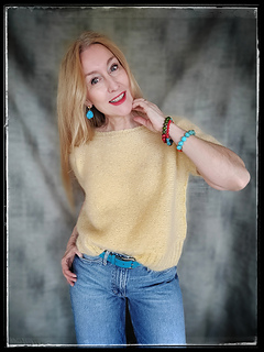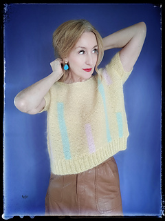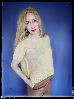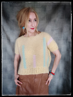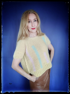 The techniques required are simple – k, p, k2tog, and being able to pick up stitches. For a beginner, the only possible challenge might be that chain stitch lines are crocheted around the armholes and around the neckline, partly to stabilize the tee and partly for aesthetics.