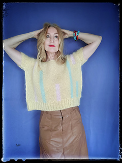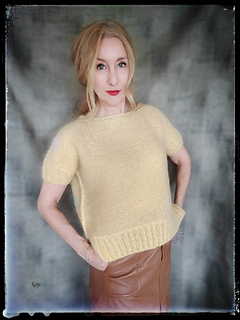 “Paa tvaers tee” is a different kind of tee. Knitted as it is from side to side. With a nicely moderated boat neck, split rib, and a sleeve shaped with short rows.