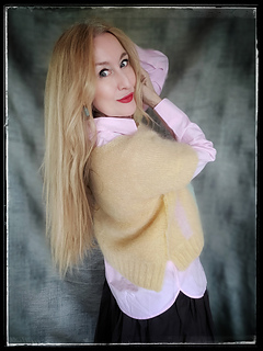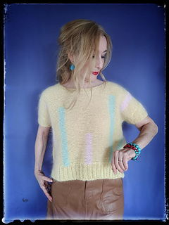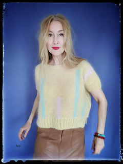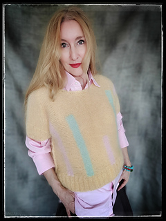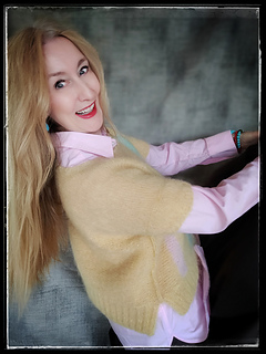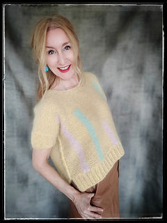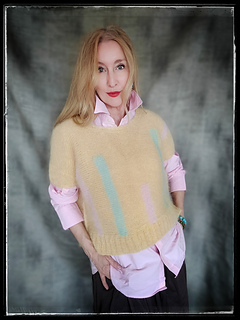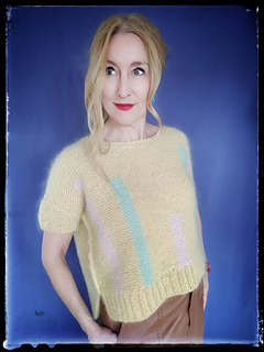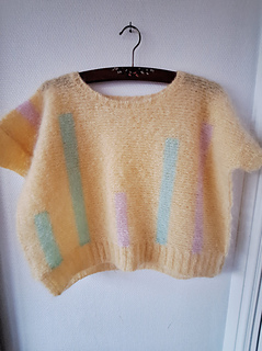 You will need between 4–5 skeins, and it can be knitted in a single strand in a yarn such as Mondial Lieve, Permin Bella or with multiple strands held together such as Drops Kid Silk. If You want to use the possibility to make the small suggested intarsia, You need a CC1 and a CC2 (2 skeins more)