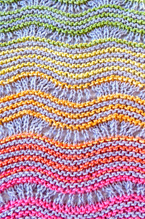 Paint a Rainbow is a semi-triangular shawl with a simple but interesting construction, squishy garter stitch combined with simple lace, and colourful stripes. You can make it with one solid and one variegated colourway, or you can use many colours - small amounts of yarn left over from other projects will be perfect. I used Miss Babs Yummy 2-Ply left after two projects: Minimalist Rainbow sweater and Scrappy Stripes mittens.