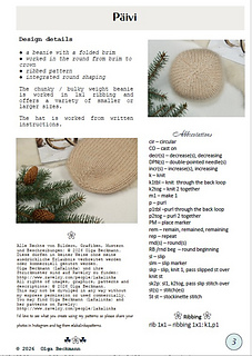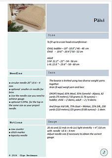 Yarn: The beanie is knitted using two diverse yarns held together. Suggested Aran (8 wpi) weigt yarn and lace.