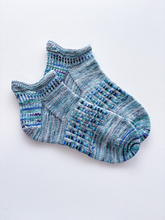 These sporty ankle socks worked in sport weight or heavy fingering weight yarn knit up in a jiffy, with just enough stranded colorwork to keep you entertained. A bit of short-row shaping at the ankle creates a pull tab to help you get your socks on, and the stranded pattern in the middle of the foot adds cushioning.