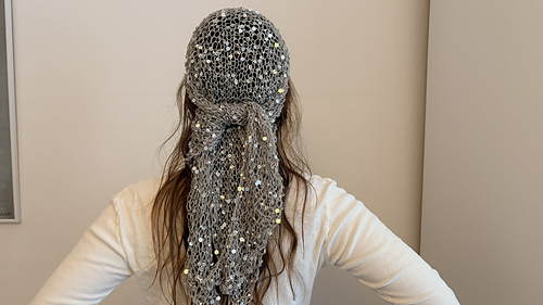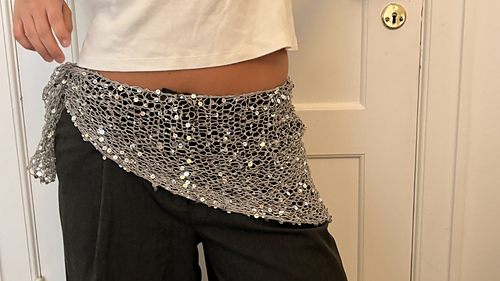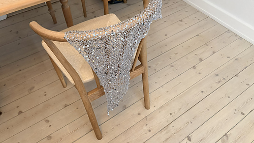 The scarf is knitted with one strand of Paljett by Sandnes Garn. For the size of scarf pictured there was used just under one skein (50 grams = 140 meters)