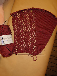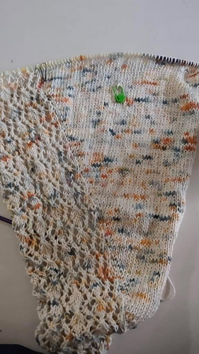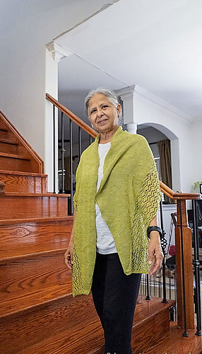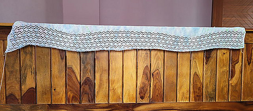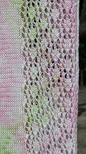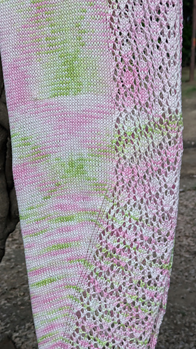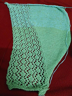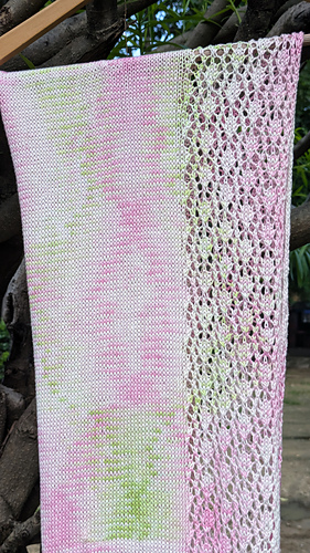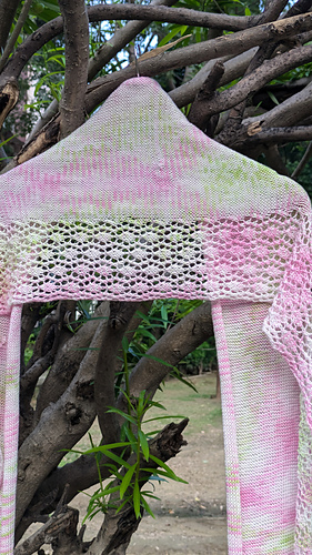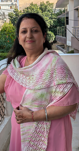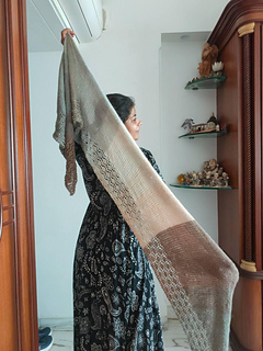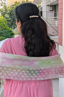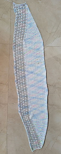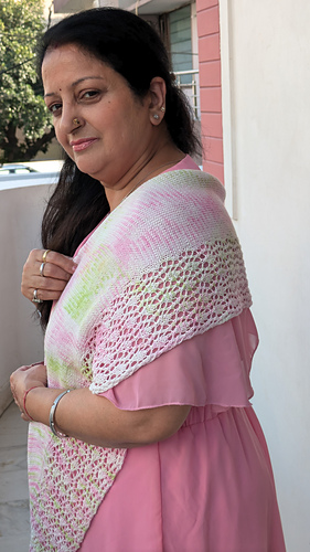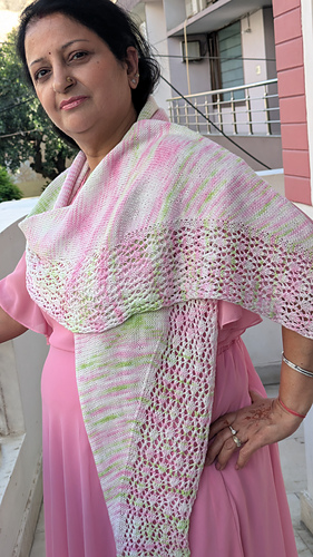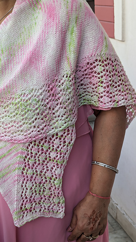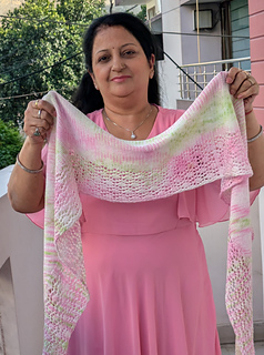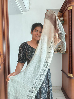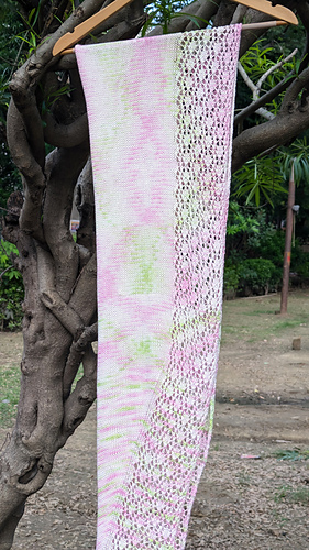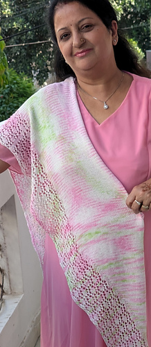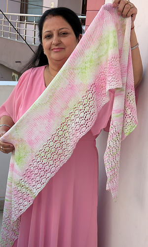 Pallav Scarf is a sideways Scarf knitted bottom up and worked from tip to tip . It begins as a sideways scarf, transitions into a rectangular shape after the increasing section and then followed by decreasing section .