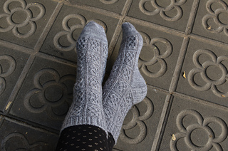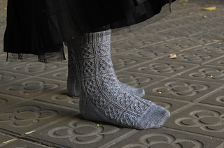 One of the most memorable things about walking through the streets of Barcelona is the beautiful sidewalk panot paving. This sock pattern was inspired by the most popular flor design, so that anyone who knits these can wear a little bit of Barcelona.