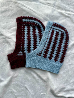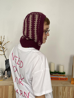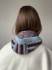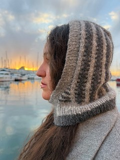 The Parallax Hood is knitted top down in a mosaic colorwork stitchpatterns,creating a vertical stripe motif and a soft texture.