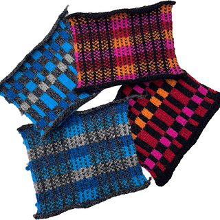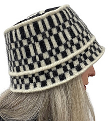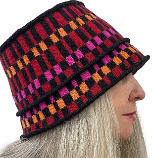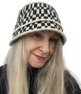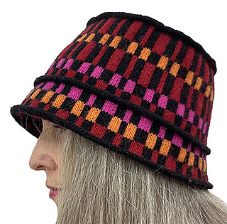 Made in pure wool on a standard gauge punchcard or electronic knitting machine, a ribber is not required. Knit from the bottom up, pintucks define the hat sections. A Fair Isle pattern is used to give weight to the fabric resulting in a hat that softly holds its shape. Flexible adult sizing is controlled by the fulling and blocking process and should fit loosely on the head. Fair Isle charts included. Video link included for pintuck technique.