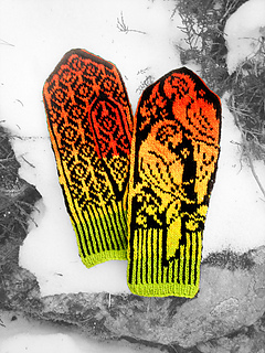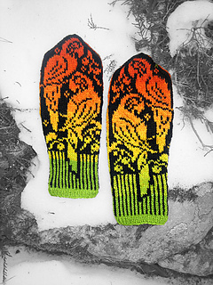 These stranded mittens with parrots can be worked in straight or negative colors. Optional duplicate stitch embroidery adds more details (only on birds’ faces).