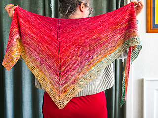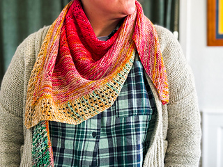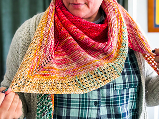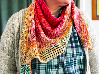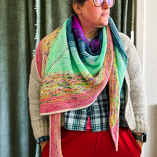This shawl is so fun to knit and wear, and will elevate any outfit. I love wearing this shape kerchief-style, wrapped around my neck with the bottom of the triangle pointing downwards.