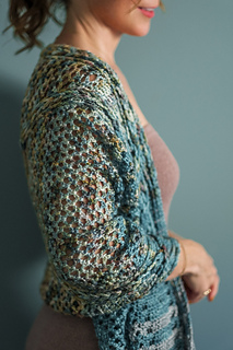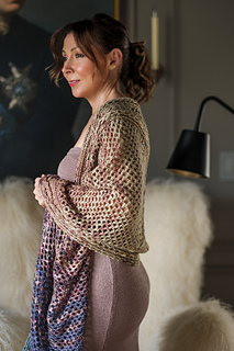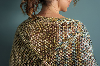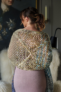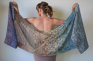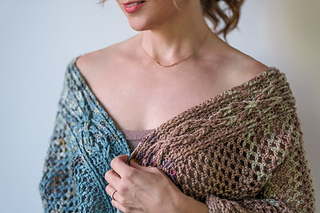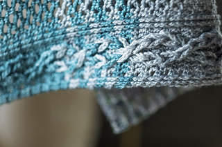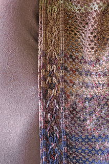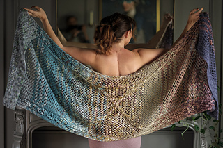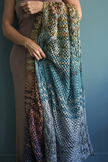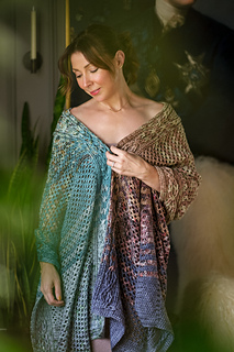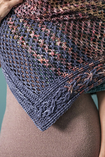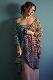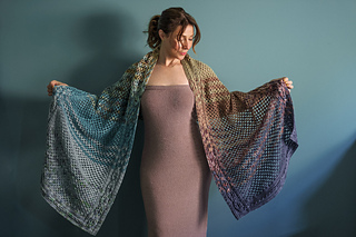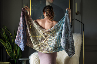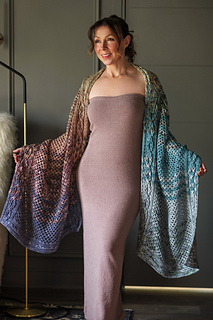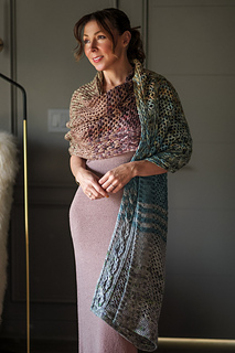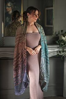 Passage is a light, flowing shawl inspired by doors, thresholds, and the quiet moment when one space becomes another. The shawl’s open lace center invites the eye to wander and is framed by Jacob’s Ladder cables that rise like architectural columns along the edges. Midway through the shawl, the inner cables separate, travel inward, and cross before returning to the borders — forming twin gothic arches that meet at the center. Beginning in tranquil blues and teals, the hues deepen through honeyed golds and burnished reds before settling into a moody, contemplative purple, like stepping from open air through torchlit arches into the hush of an inner hall. The drape is fluid and airy and shifts gently with movement. Approachable for adventurous beginners yet layered with thoughtful detail, Passage balances openness and structure. Each stitch marks a crossing, an invitation to step forward.