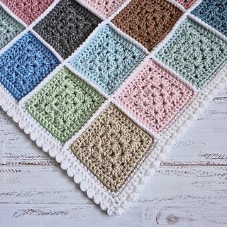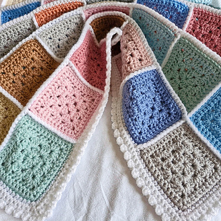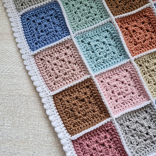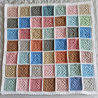 The finished sample measures approximately 65cm square (Moses basket / car seat size) and uses 49 squares. The modular design means you can easily adjust the size by adding or removing squares.