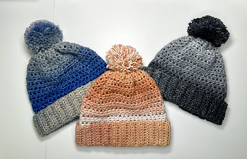 This incredibly simple beanie pattern is both quick and enjoyable to create! The yarn creates a charming patchwork design. You can either craft a matching pompom or opt for a faux fur pompom to