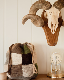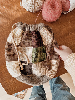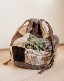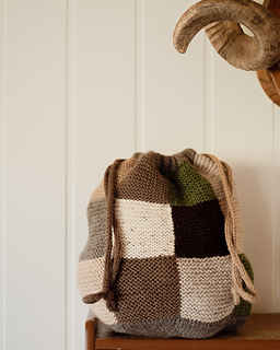 Patchwork Bucket Bag er en morsom strikket prosjektpose strikket av lapper i rillestrikk. Den er perfekt for restegarn. Hver rute i posen krever kun 6-7 g garn, så her kan du virkelig boltre deg i restegarnslageret.