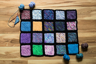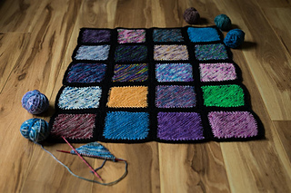 Fingering Weight Yarn - each knitted square uses about 5 grams of yarn. I used different color scraps for each square and solid black between the squares.