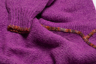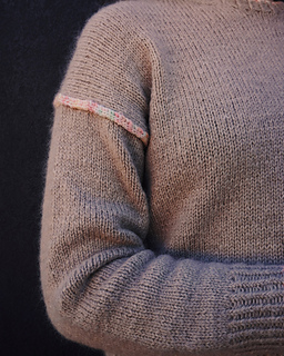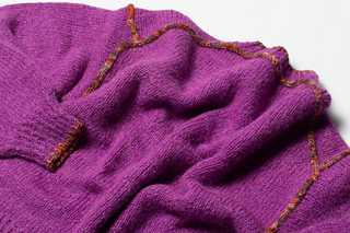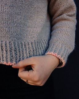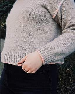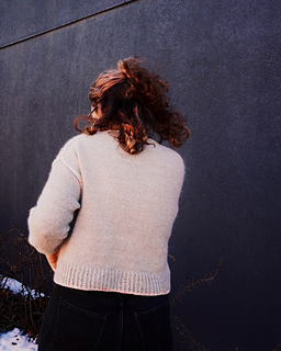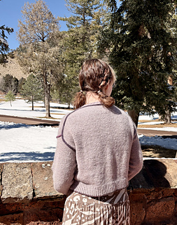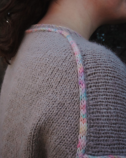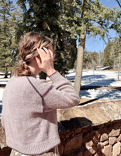 The back is worked flat with short rows and increases to shape the neckline and shoulders. The left and right fronts are picked up along their respective back increase edge and worked flat with increases to shape the necklines. The fronts are joined together and worked flat to create the armholes. After joining the front and back in the round, the body is worked in stockinette stitch and finished with a twisted rib hem. The taper/balloon sleeves are picked up and worked in stockinette in the round and finished with twisted rib cuffs. The collar is picked up and worked in twisted rib. Finally, i-cord accents are worked along the shoulder seams and armholes.