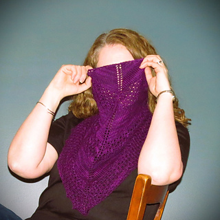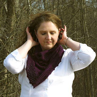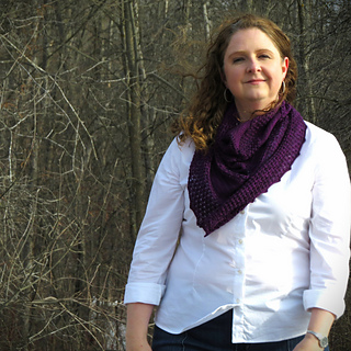 Patty’s Cowl is a single skein, fingering weight, bandana style cowl. Knit flat, from the top down, with some short rows to add some length at the front without the bulk at the back. It features alternating bands of stockinette and lace and is finished off with a scalloped edge.