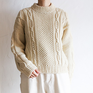全体に入った模様編みが美しい、首元が詰まったデザインのセーターです。